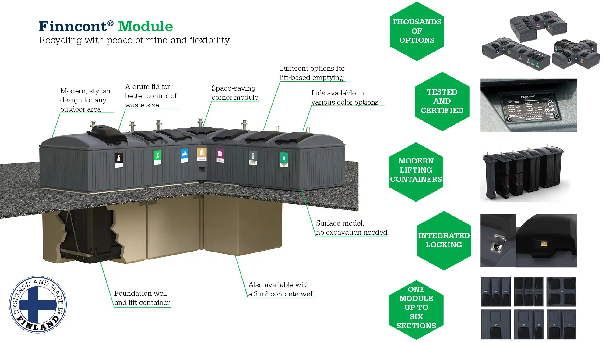 Finncont® Module is an innovative and adaptable modular recycling system that can be easily customised to suit different applications. As a new feature, a unique corner lid is available to maximise space utilisation and provide greater flexibility in set-up. Together with a module that can be divided into up to six different fractions, Module makes it possible to collect multiple fractions in a record-breaking area - optimising the use of every square metre and making it possible to place a recycling station on even the tightest of plots.