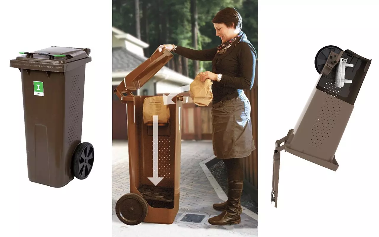 Biojäteastia, joka on suunniteltu vähentämään nestettä ja hajuja mahdollistaen neljän viikon tyhjennysvälin